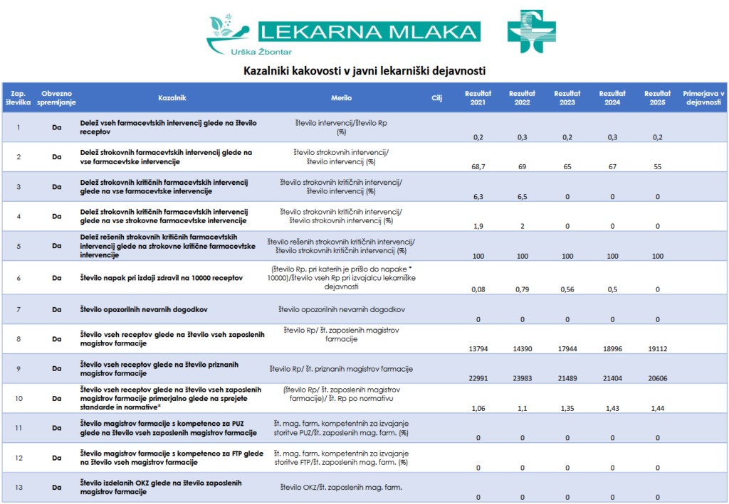 V Lekarni Mlaka v skladu z veljavno zakonodajo vzdržujemo in spremljamo sistem kakovosti, ki vključuje: